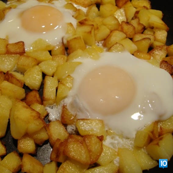 Patatesler küp küp doğranır, bol yağda kızartılır. Kızartılan patatesler( tuz ekilerek) tavaya alınıp, üzerine çırpılmış yumurta yaydırılır. Patateslerin altı kızarınca kapak veya tabak yardımı ile ters çevrilerek üstü de kızartılır.(ben biraz fazla kızartırım) isteğe göre baharat dökerek servis yapılır.