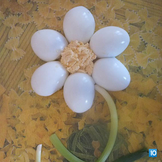 Malzeme miktarını size bırakıyorum. Yumurta ve sucuk. Yumurtaları haşlayın, sucuğu dilimleyip kızartın. Haşlanan yumurtaları uzun uzun dilimleyin. Tabağın ortasına sucukları koyun kenarına da yumurta dilimlerini papatya yaprakları şeklinde dizin. Dilerseniz domates dilimleriyle daha süslü hale getirebilirsiniz. Afiyet olsun.