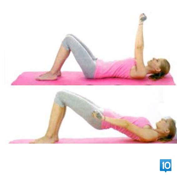 Yukarı kaldırdığınız beliniz ne çok yukarıda ne de çok aşağıda olmalı; omuzlarınızdan dizlerinize doğru düz bir çizgi oluşturmalısınız. Nefes alın, nefes verirken sırt omurlarından başlayarak gövdenizi yere indirin.Bu hareketi 5 kez yapın, başlangıç pozisyonunda 30 saniye dinlenip 5 tekrar daha yaparak 10’a tamamlayın.