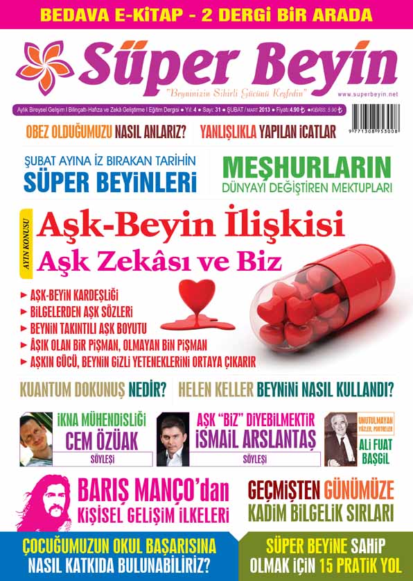 Türkiye’nin en iyi Bireysel Gelişim / Bilinçaltı – Hafıza ve Zekâ Geliştirme / Eğitim Dergisi SÜPER BEYİN Şubat sayısı çıktı. 2013 yılında da sizi heyecanlandırıp hayatınıza anlam katacak, beyninizi daha etkin ve verimli kullanarak yaşam maratonunuza katacağınız birçok pratik yöntemler bulmanıza yardımcı olacak yine çok özel bir sayı okuyacaksınız.